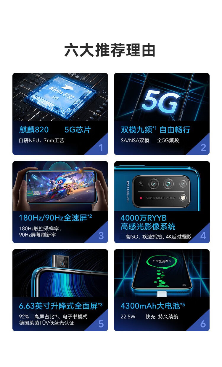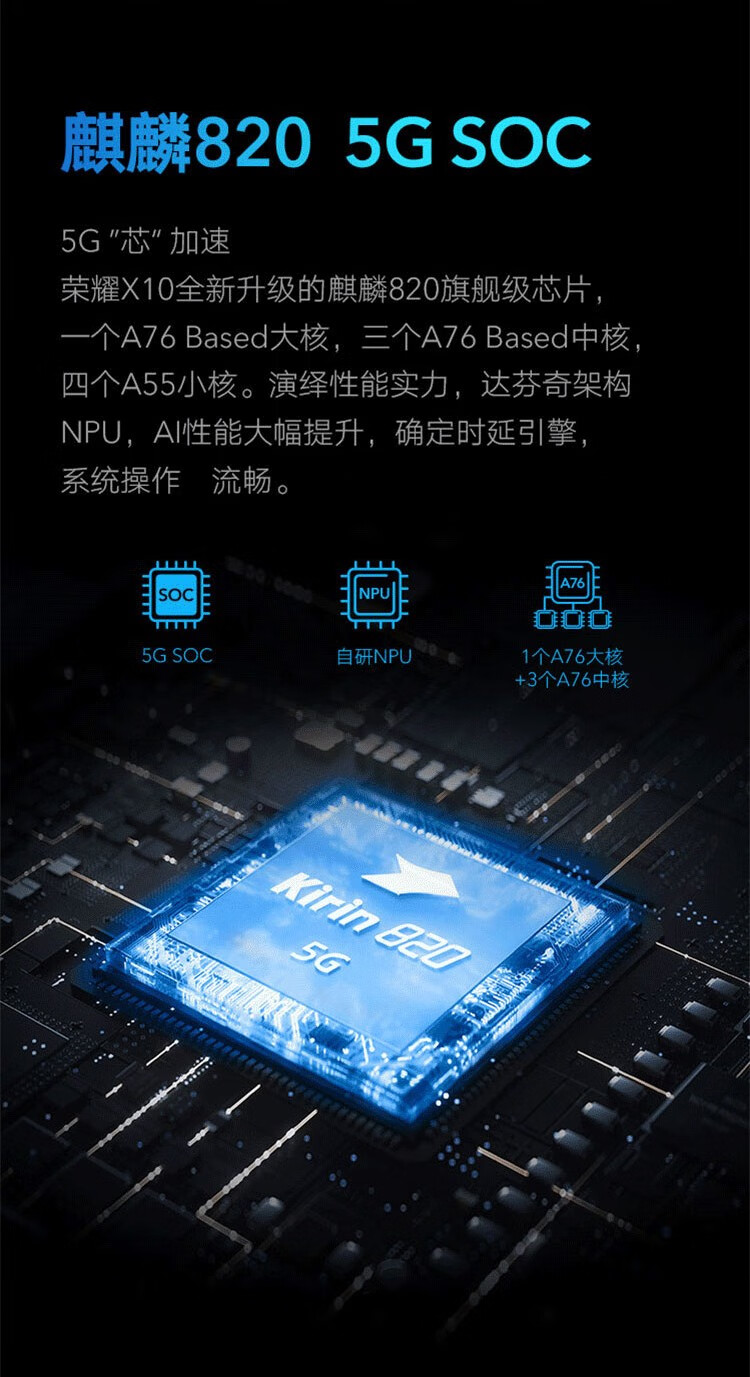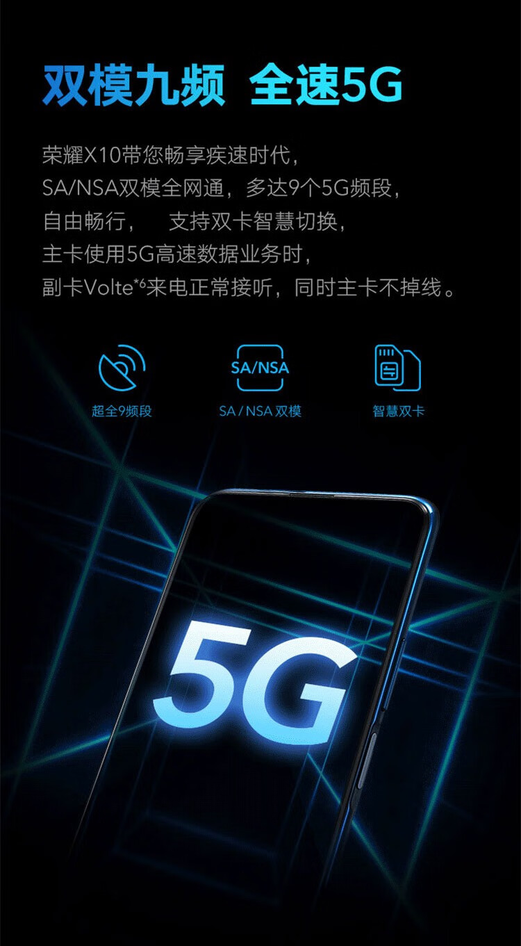 荣耀X10 5G双模 麒麟820 4300mAh续航 4000万高感光影像系统 6.63英寸升降全面屏