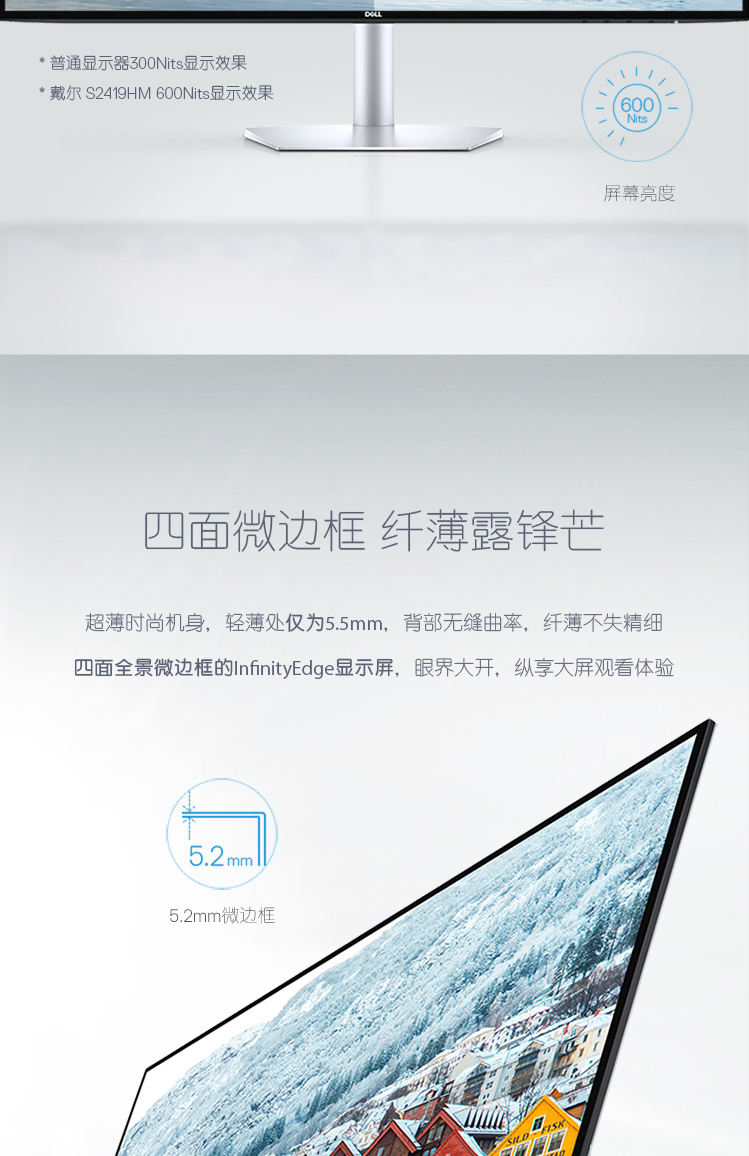 戴尔(DELL) S2419HM 23.8英寸 IPS 低蓝光不闪屏 四边微边框 600尼特 个人商用办公 电脑显示器