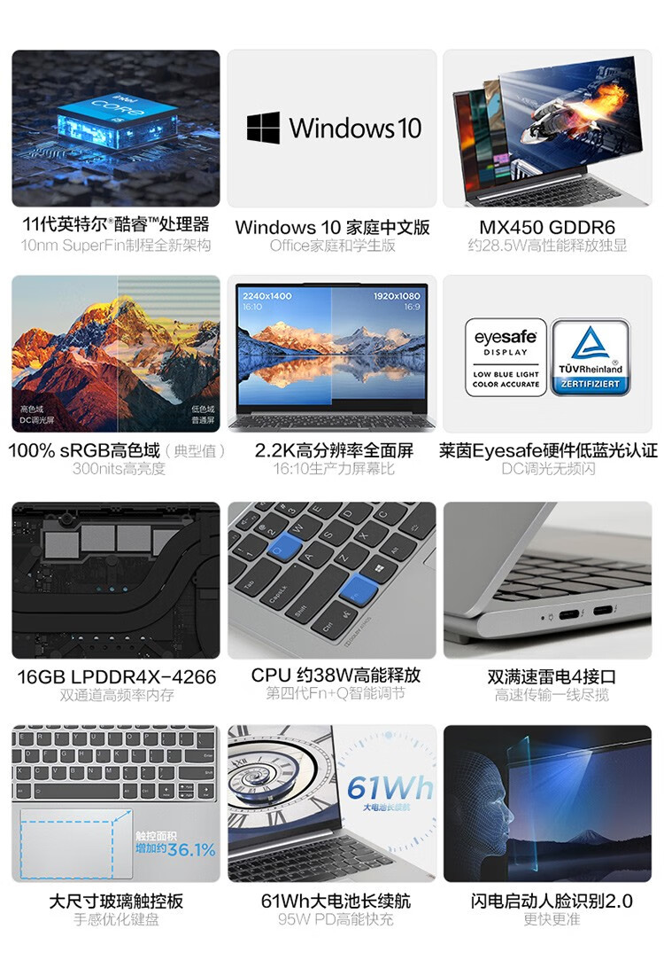 联想(Lenovo)小新Pro14 2021款 2.2K全面屏 轻薄笔记本电脑办公设计游戏本 i5-1135G7 16G 512G固态 标配 MX450 GDDR6