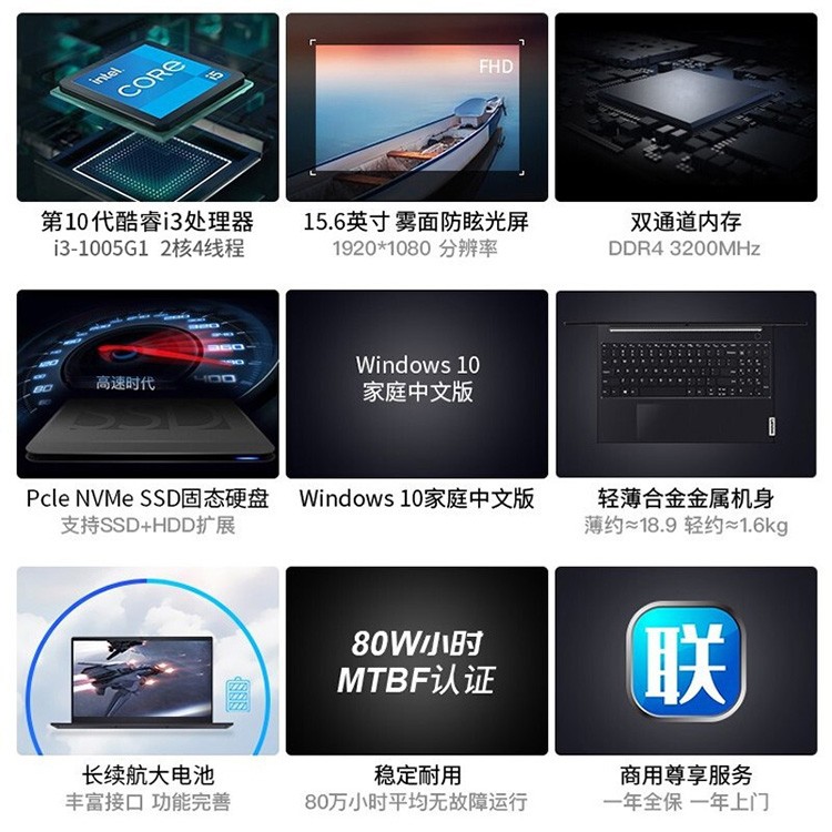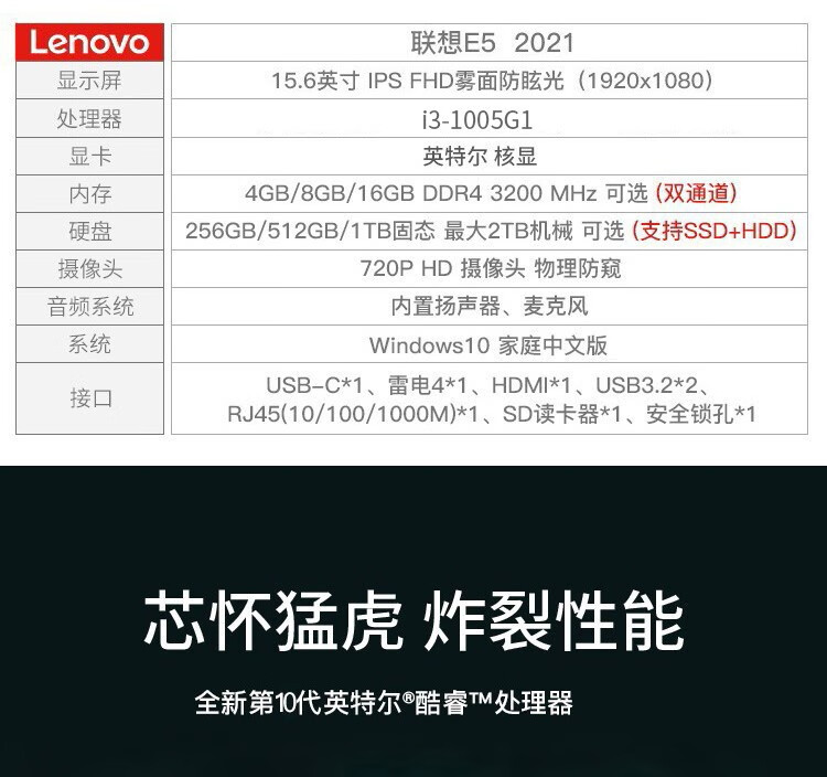 联想(lenovo) 昭阳E5酷睿15.6英寸大屏商用高性能学生商务设计轻薄游戏笔记本电脑 标配i3-1005G1 4GB 256G固态 预装win10 高清屏 可升级内存